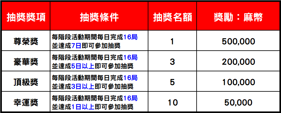 活動期間每日進行[棋牌遊戲]>[金旺來麻將]>注額「1500/500」以上之「湊桌」完成「16局」以上(不含金旺來麻將比賽),每階段活動結束時即可參加抽獎!每完成「20局」再加碼送「轉轉樂1次」,玩得越多送得越多!