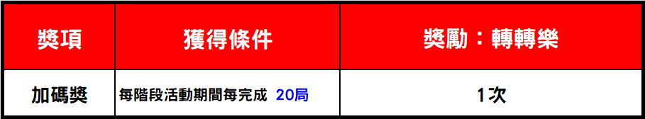 舉例1:某階段活動期間完成「21局」,則可獲得「轉轉樂1次」。