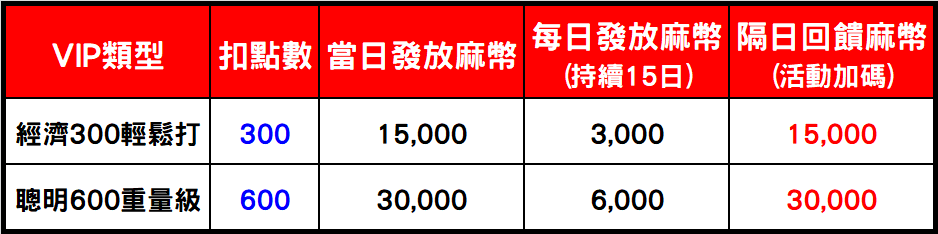 活動期間[登入遊戲]>[銀行保險箱]>[VIP設定]>[VIP費率設定]>[經濟300輕鬆打/聰明600重量級]>[進行VIP次數設定],依設定之VIP類型次數隔日回饋麻幣!