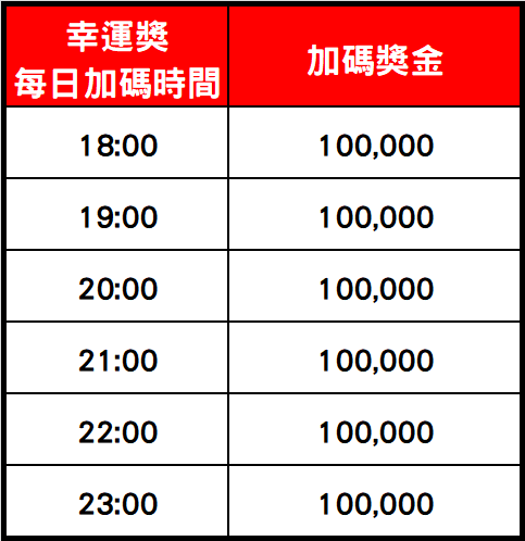 - 幸運獎獎金實際加碼時間可能會有些許誤差,最終以系統判定為主。