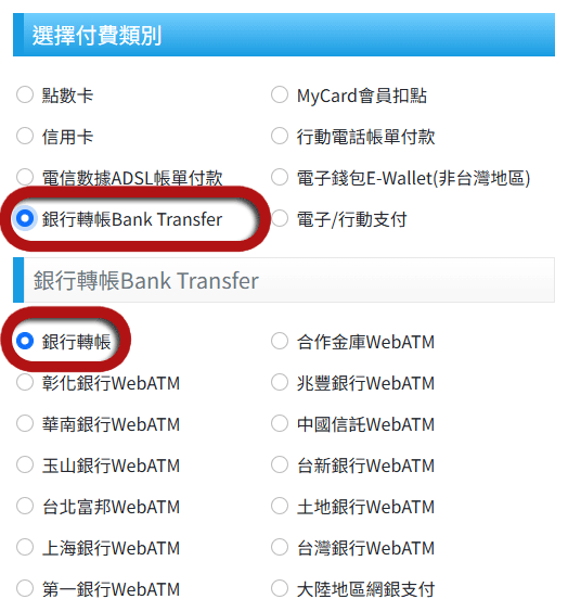 [會員專區]>[線上儲值]>[MyCard儲值]>[銀行轉帳Bank Transfer]>「銀行轉帳」