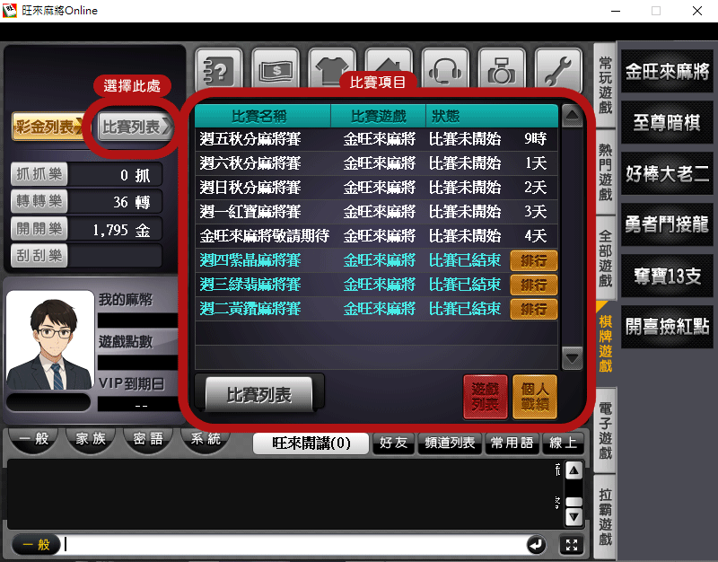 活動期間每日進行[比賽列表]>[比賽遊戲:金旺來麻將]>[參加比賽],每日完成「8局以上麻將比賽」即可參加幸運獎抽獎!