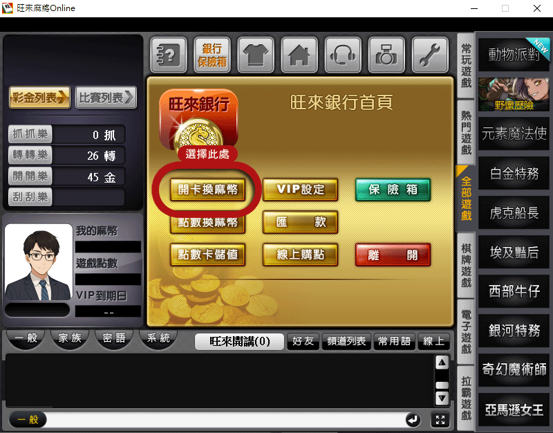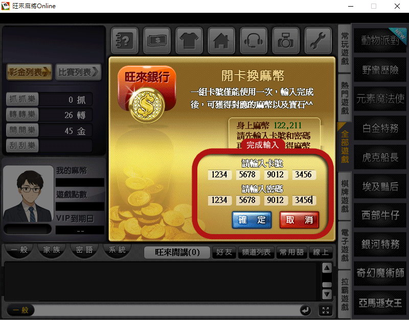[登入遊戲]>[銀行保險箱]>[開卡換麻幣]>[輸入卡號/密碼]>[確定]