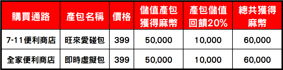 活動期間購買「產包」進行儲值,除了可獲得原本「50,000麻幣」與特定寶石外,還可額外獲得麻幣回饋!