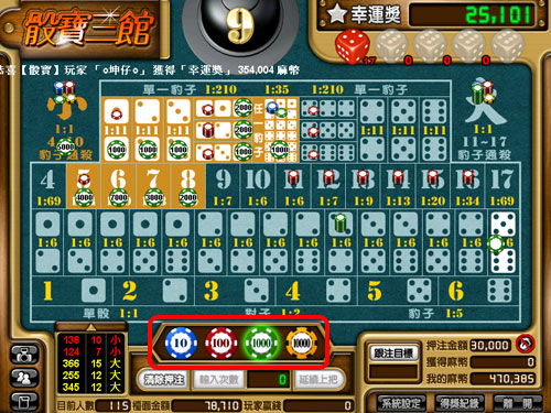 將籌碼拖曳到押注區最下方,6格的1、2、3、4、5、6。請注意下方賠率說明,當玩家押1,若骰盅內出現1粒1,則可獲得1:1的賠率獎金(即押注金的2倍),若出現2粒1(即對子),則可獲得1:2的賠率獎金(即押注金的4倍),內出現3粒1(即豹子),則可獲得1:5的賠率獎金(即押注金的6倍)。