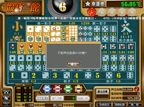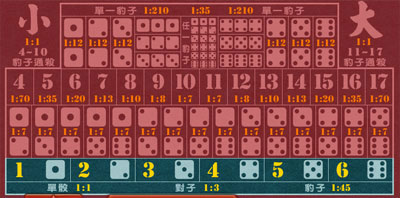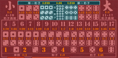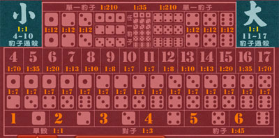 若骰盅出現任何一組豹子時,則任何押大小的押注金都會輸給系統,即使是2豹子總合為6。