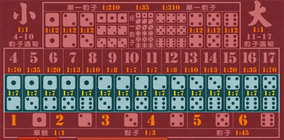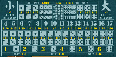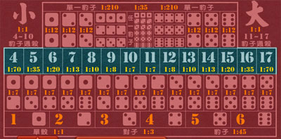 將籌碼拖曳到押注區中間區塊的4、5、6…、16、17的格子上。若3粒骰子與玩家預測總合相同,可以獲得數字上對應的賠率(每種組合賠率不相同)。例如押4(賠率1:69),若押注1000,除本金1000外,還可得69000獎金。