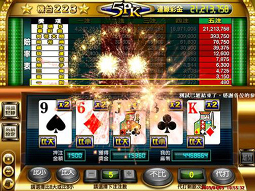 當結算牌型符合「賠率表」上之特殊牌型時(四張5除外),即可進入「五關比大小」的闖關遊戲,您需依序猜出五張蓋牌比8大或8比小,幸運猜對即過一關,則原先賠率獎金會「乘以2倍」計算…過第一關是2倍、過二關是4倍(2*2)、三關是8倍(2*2*2)、四關是16倍、五關是32倍;您亦可選擇「不比」直接獲得賠率獎金。 |