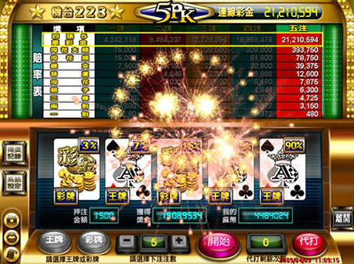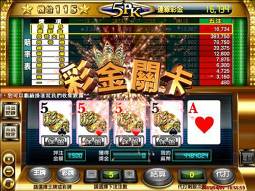若結算牌型符合「賠率表」上之「四張5拿彩金」牌型(其它牌型除外),即可進入「彩金關卡」猜猜五張蓋牌是「王牌A」或「彩牌5」,每一張牌代表獲得連線彩金的成數,猜中第一張蓋牌代表彩金3%,第二張是7%,第三張是15%,第四張是35%,第五張是90%,獲得之獎金還需視目前連線彩金的金額大小。 |